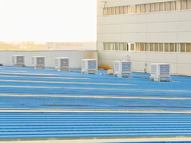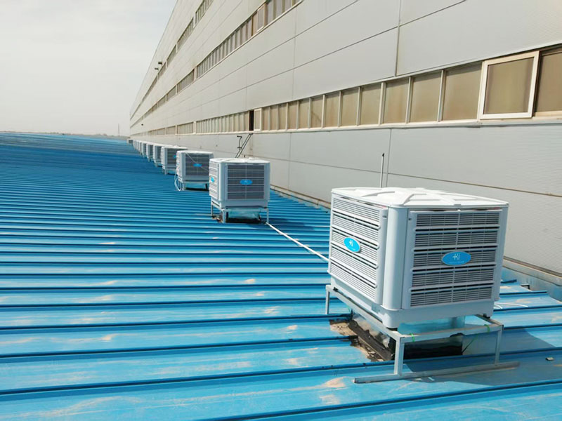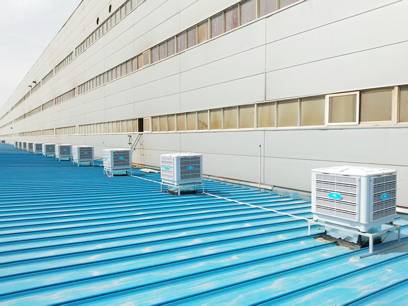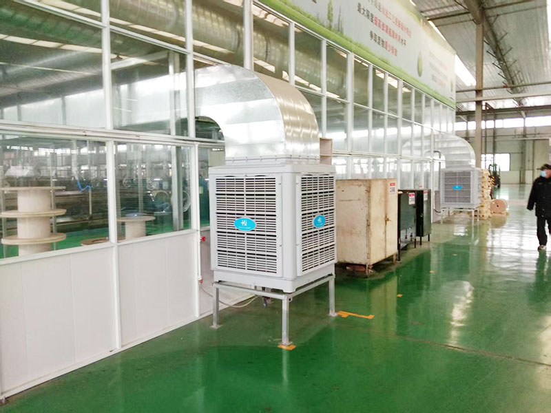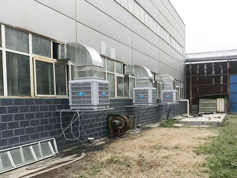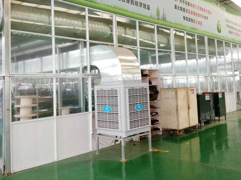 目前该环保空调项目已完成安装的158台,降温面积42000㎡。该项目环保空调工程顶楼车间都采用穿楼板用大风口摇摆送风整体降温,其他车间都采用走管道岗位式定点降温。