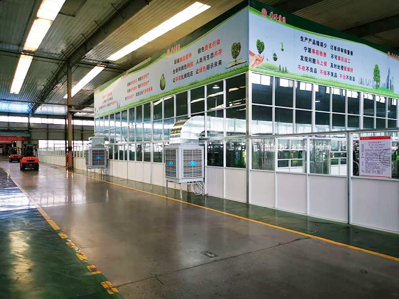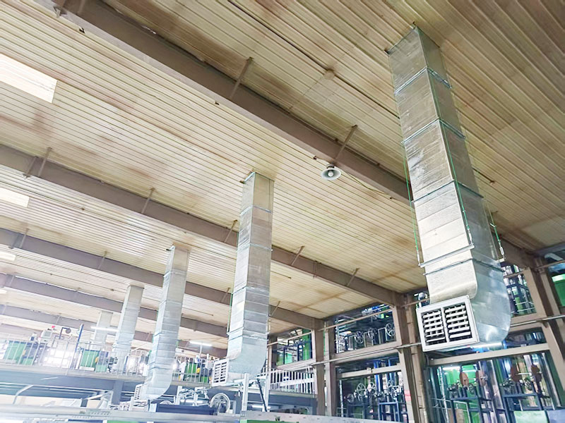 针对该厂房的具体情况设计使用朗旗环保空调进行通风降温改善车间工作环境。高温车间我们才用环保空调管道穿楼板用大风口摇摆送风整体降温,普通车间采用侧墙安装走管道式定点岗位送风,把室内闷热及异味空气排出车间,使车间内部一直保持有新鲜且经过降温的空气。
