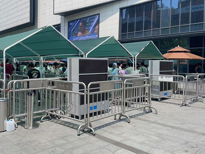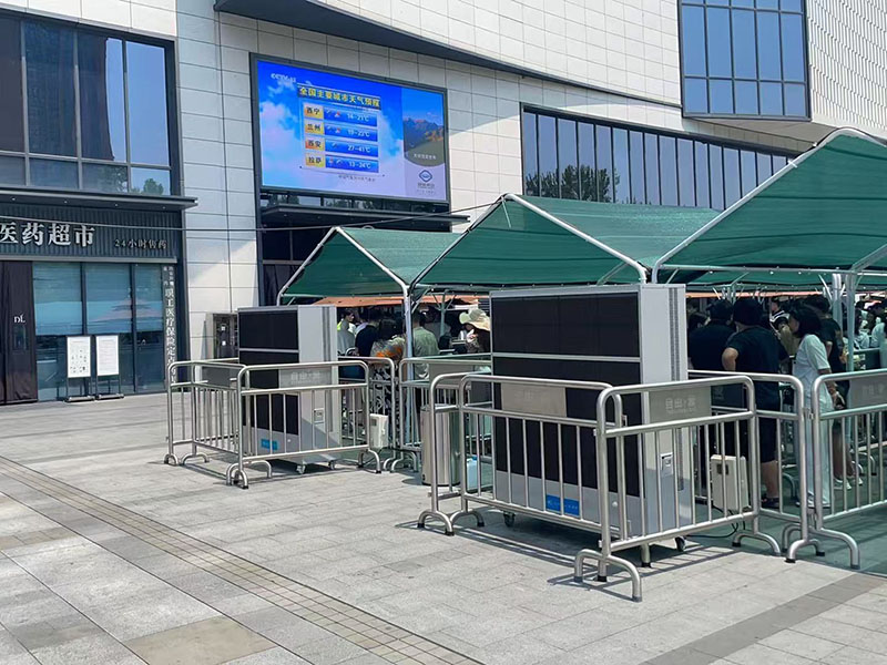胖东来天使城超市由于每天都有大量的群众在排队,炎炎夏日一直没有得到完善的解决,胖东来团队经过多方对比考核,最终选择科瑞莱环保空调移动机型来为排队的群众驱除夏日高温,带来凉爽的冷风。