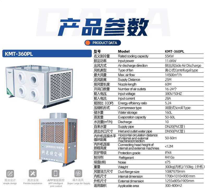 配置大牌原装涡旋压缩机,大风量,快速降温,降温面积300-400平方,大型厂房车间专用。